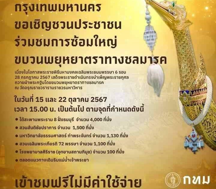 “กรุงเทพมหานครจึงขอเชิญชวนประชาชนร่วมชมการซ้อมใหญ่ขบวนพยุหยาตราทางชลมารค โดยได้จัดเตรียมสถานที่สำหรับรองรับประชาชนตามจุดต่าง ๆ ได้แก่