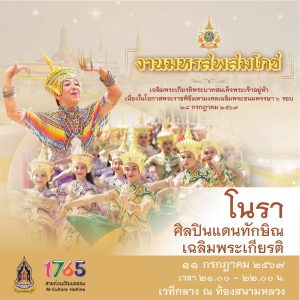 “การร่ายรำโนราที่งดงามและอ่อนช้อย” จากการแสดง “โนราศิลปินแดนทักษิณเฉลิมพระเกียรติ” ในวันที่ ๑๑ กรกฎาคม ๒๕๖๗ เวลา ๒๑.๐๐ – ๒๒.๐๐ น. ณ เวทีกลาง ท้องสนามหลวง