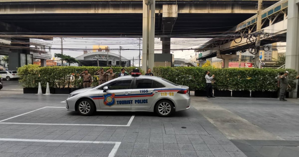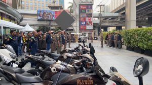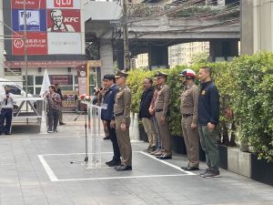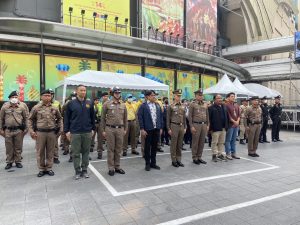 เจ้าหน้าที่สายตรวจ ส.ทท.3 กก.1 บก.ทท.1 จนท.ตร.สน.บางยี่ขัน และเจ้าหน้าที่ในส่วนที่เกี่ยวข้อง ร่วมปล่อยแถวระดมกวาดล้างอาชญากรรม เนื่องในเทศกาลวันสงกรานต์ หน้าลานห้างสรรพสินค้าเซ็นทรัล ปิ่นเกล้า