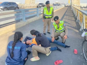 ตำรวจท่องเที่ยวธนบุรี ออกตรวจดูแลความปลอดภัย พบเห็นหนุ่มใหญ่เป็นลมแดดหมดสติอยู่บนสะพานพระราม 8 เร่งรุดเข้าช่วยเหลือเอาไว้ได้ทัน