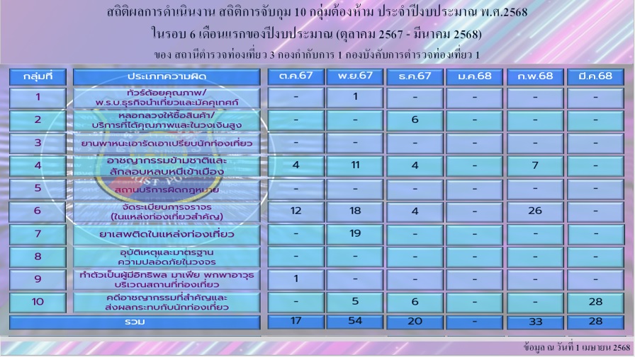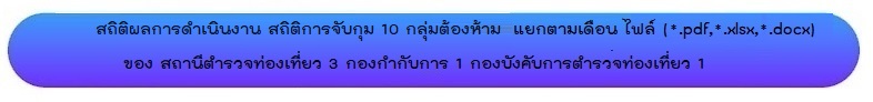 สถิติผลการดำเนินงานการจับกุม ๑๐ กลุ่มต้องห้าม เดือน มีนาคม ๖๘ ดาวน์โหลด ไฟล์ เดือน กุมภาพันธ์ ๖๘ ดาวน์โหลด ไฟล์ เดือน มกราคม ๖๘ ดาวน์โหลด ไฟล์ เดือน ธันวาคม ๖๗ ดาวน์โหลด ไฟล์ เดือน พฤศจิกายน ๖๗ ดาวน์โหลด ไฟล์ เดือน ตุลาคม ๖๗ ดาวน์โหลด ไฟล์