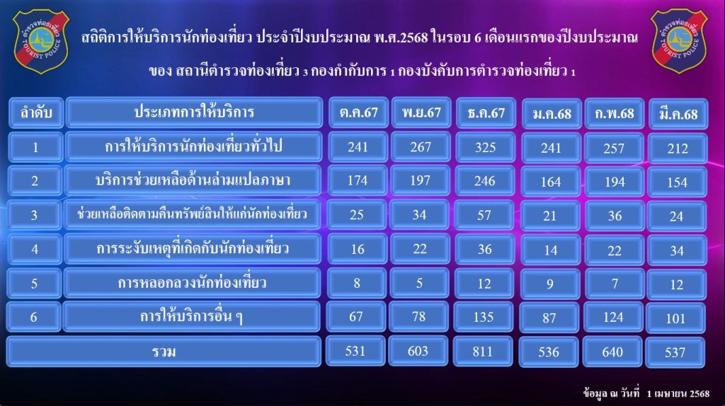สถิติการให้บริการนักท่องเที่ยว ประจำปีงบประมาณ พ.ศ. ๒๕๖๘ ในรอบ ๖ เดือนแรกของปีงบประมาณ