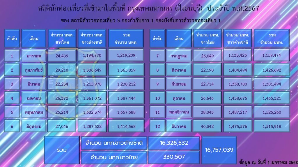 สถิตินักท่องเที่ยวที่เข้ามาในพื้นที่ กรุงเทพมหานคร (ฝั่งธนบุรี) ประจำปี พ.ศ. ๒๕๖๗